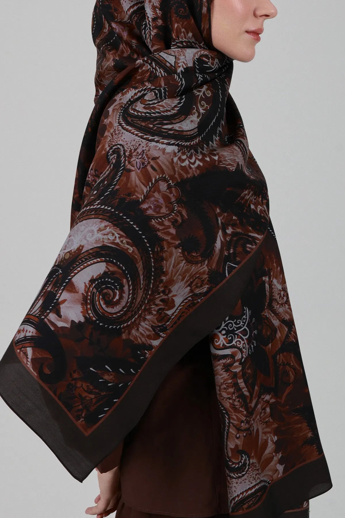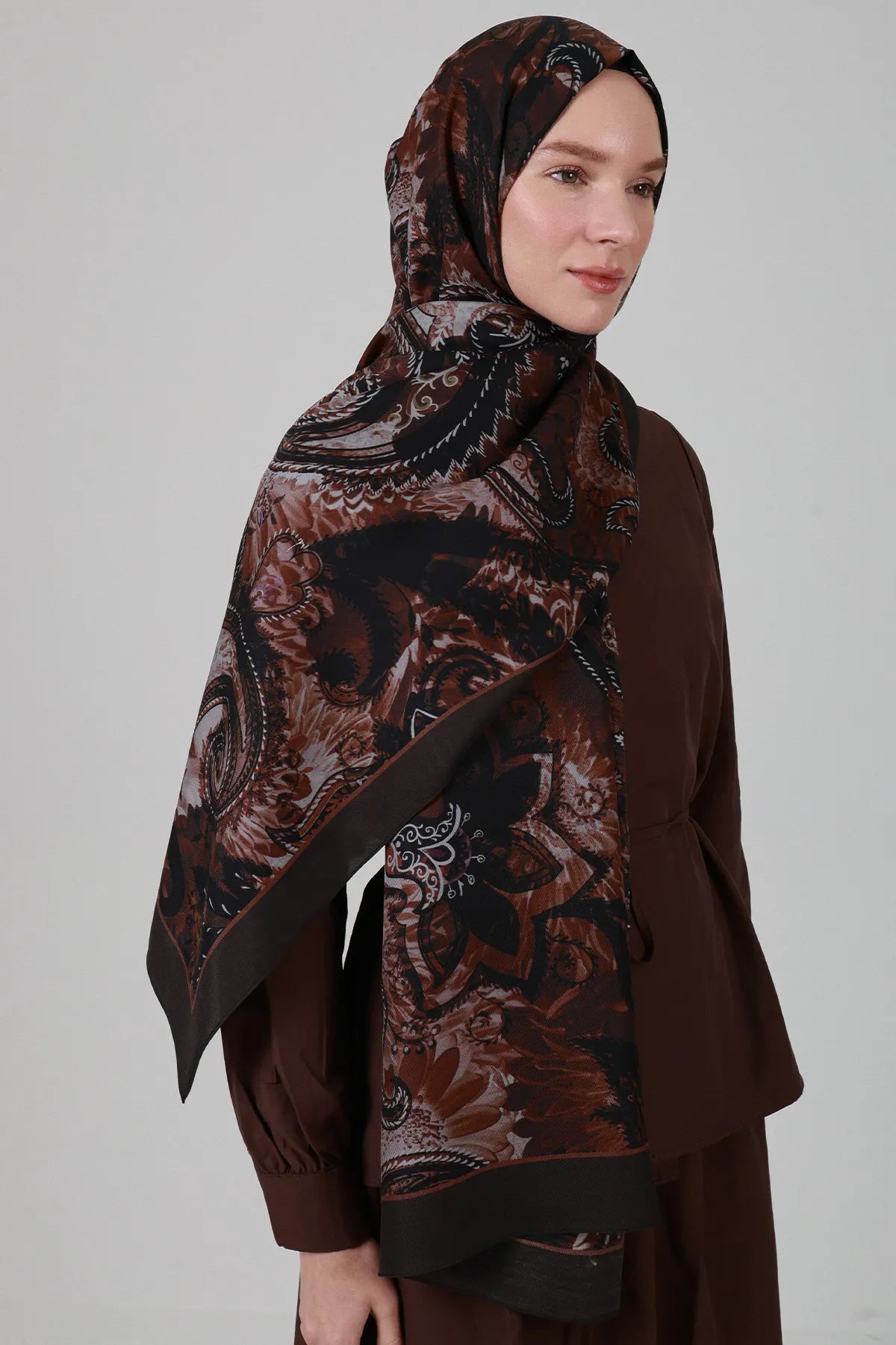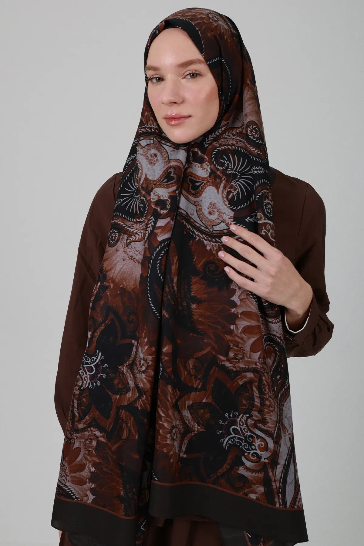 Sepya Desen İpek Şal - Kahve